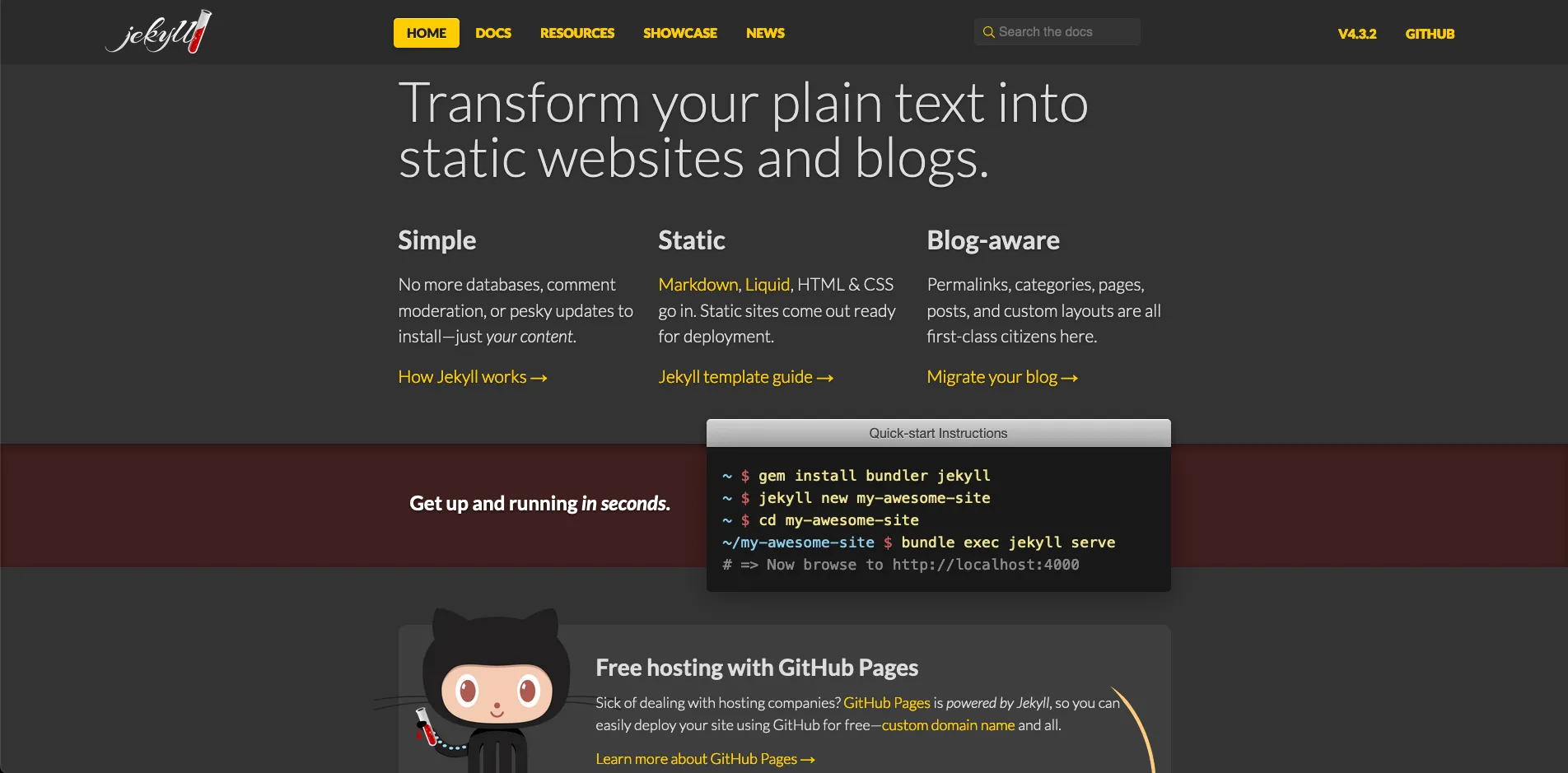 De nombreux développeurs ont également utilisé GitHub Pages pour héberger leurs blogs. Jekyll, un générateur de sites statiques écrit en Ruby, est d’ailleurs directement intégré avec GitHub Pages. Il vous permet d’obtenir les fonctionnalités classiques d’un blog simplement, à savoir d’ajouter des catégories et des tags et de mettre en place un système de gestion de commentaires via Disqus.